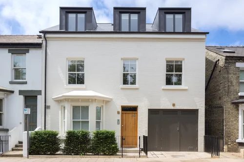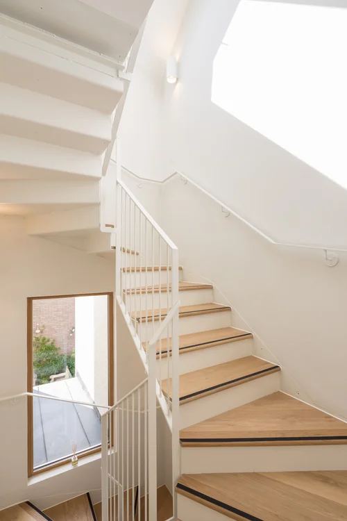A contemporary development of six luxury flats, designed by MOOi Architects for a private developer in Cambridge. A shared private rear garden knits the apartments together, with a modern palette of white painted masonry, black steel balustrades and oak joinery.