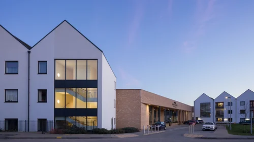 This distinctive residential development in central Bury St Edmunds was designed by MGM and Mole Architects. High tensile steel ties form a trellis, encouraging climbing plants which envelop the facade with rich colour and texture.